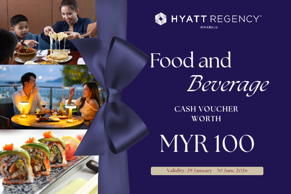 • This e-voucher entitles the bearer to the value of MYR 100 nett and valid for redemption at any outlet at Hyatt Regency Kinabalu only