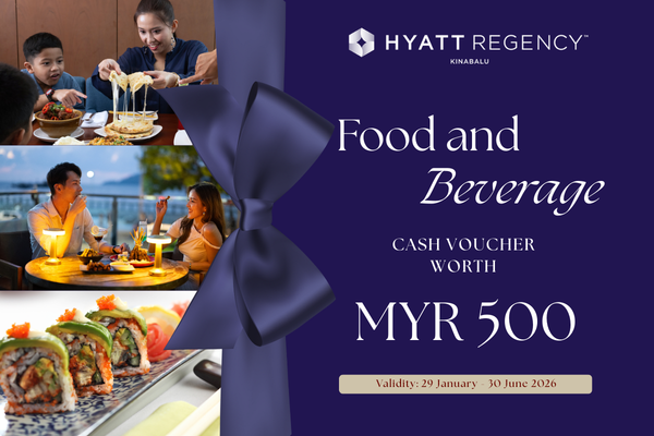 • This e-voucher entitles the bearer to the value of MYR 500 nett and valid for redemption at any outlet at Hyatt Regency Kinabalu only