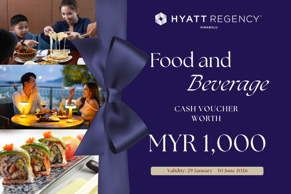• This e-voucher entitles the bearer to the value of MYR 1,000 nett and valid for redemption at any outlet at Hyatt Regency Kinabalu only